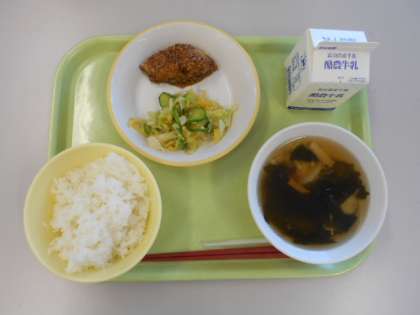 ごはん、ぎゅうにゅう、ふくらぎのごまだれがけ、あわせあえ、マコモタケのおすいもの