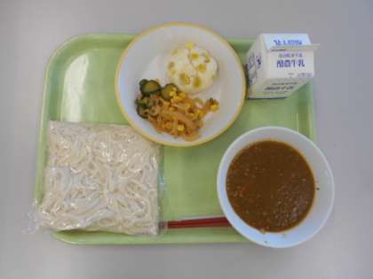 ソフトめん、ぎゅうにゅう、ソフトめんのカレーソース、むしパン、だいこんサラダ