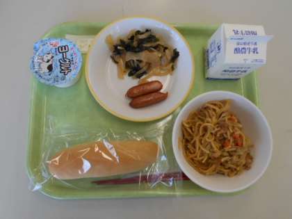 コッペパン(減)、ぎゅうにゅう、あらびきウインナー、こんにゃくサラダ、やきそば、ヨーグルト