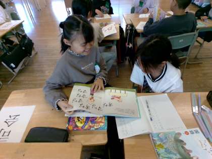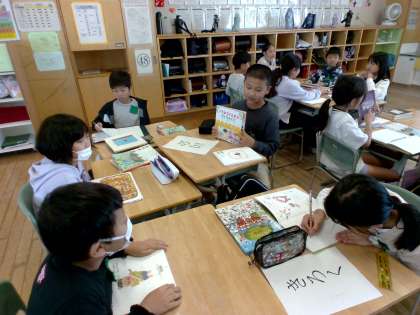 国語科の学習では、班ごとで友達に読み聞かせをするのに適した本を選ぶ話合いをしています。