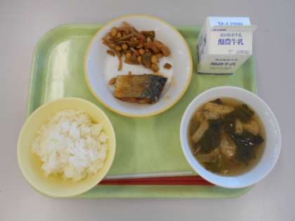 ごはん、ぎゅうにゅう、さかなのあまみそかけ、ごもくにまめ、うすくずじる