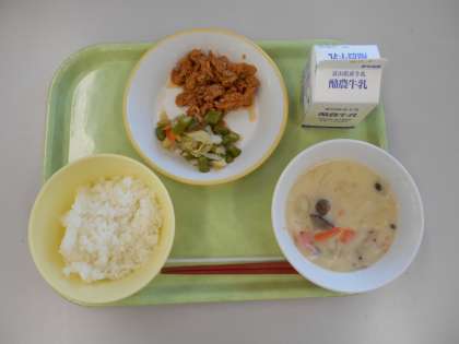 ごはん、ぎゅうにゅう、ポークチャップ、アスパラサラダ、あきのかおりシチュー