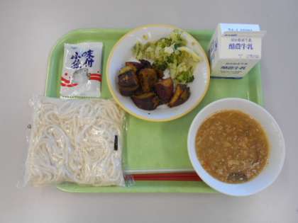 ソフトめん、ぎゅうにゅう、ソフトめんのにくみそ、だいがくいも、やさいのドレッシングあえ、あじつけこざかな