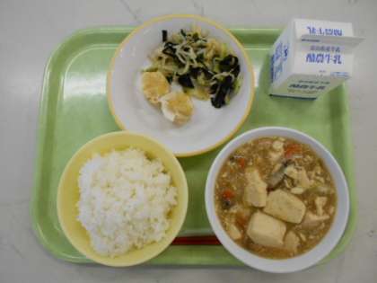ごはん、ぎゅうにゅう、にんじんシューマイ、すのもの、えびととうふのうまに