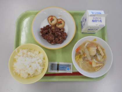 ごはん、ぎゅうにゅう、やさいのにくまき、にまめ、たいりょうなべ、のりつくだに