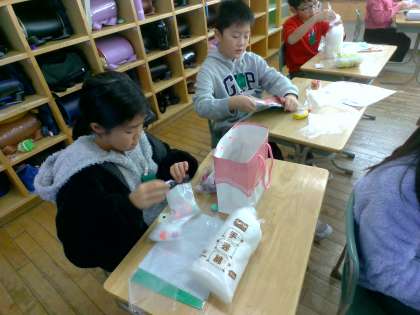 「カラフルフレンド」を作っています。いろいろな材料を使って自分の表したいものを表現しようと取り組んでいました。