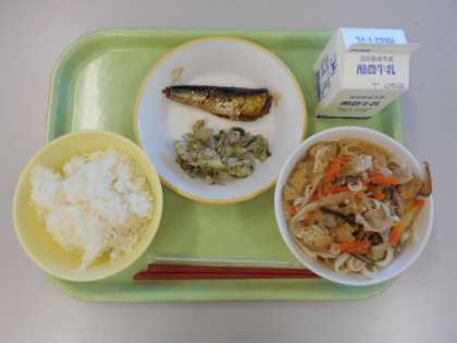 ごはん、ぎゅうにゅう、いわしのしょうがあじ、ゆかりあえ、ごもくうどん