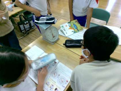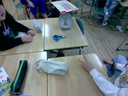 重さを表す「g」グラムについて学習した後に、実際にはかりを使って様々なものの重さをはかりました。