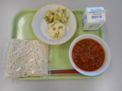 ソフトめん、ぎゅうにゅう、ソフトめんのミートソースかけ、むしパン、はくさいとりんごのサラダ