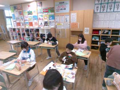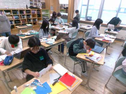 図工の時間に飛び出す仕掛けのカードを作っています。家族や友達に向けてクリスマスカードを作っている子も多くいます。