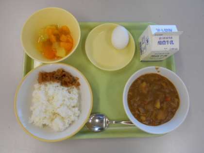 ごはん、ぎゅうにゅう、カレーライス、ゆでたまご、ふくしんづけ、フルーツゼリーミックス
