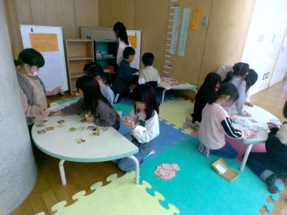 新しく設けたコーナーで、すごろくやかるた等をしてなかよく遊ぶ姿が見られます。このコーナーの名前を子供たちに募集しています。子供たちが進んで関わり合う場になってほしいと願っています。