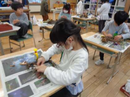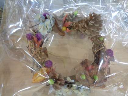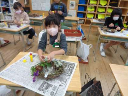 生活科では、大切に育てたあさがおのつるを使って、リースをつくりました。葉っぱや木の実などを飾って、素敵に仕上げました。