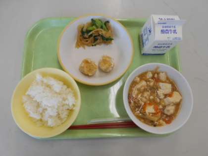 ごはん、ぎゅうにゅう、にんじんシューマイ、だいこんナムル、マーボーどうふ