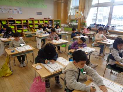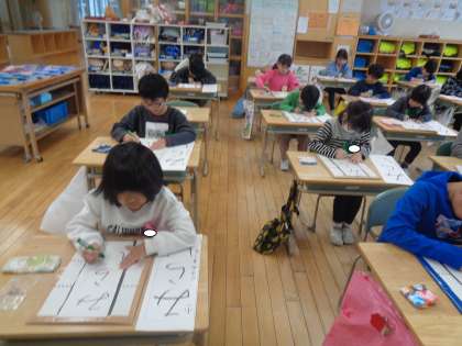 書写では、書き初めの練習をしています。硬筆墨で力強く書く練習をしています。
