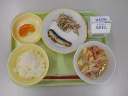 ごはん、ぎゅうにゅう、いわしのとさに、ゆかりあえ、しおにくじゃが、あいか
