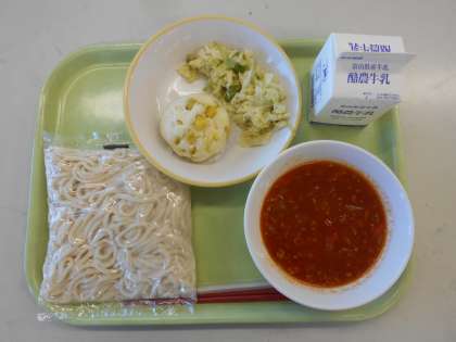 ソフトめん、ぎゅうにゅう、ソフトめんのミートソースかけ、むしパン、グリーンサラダ