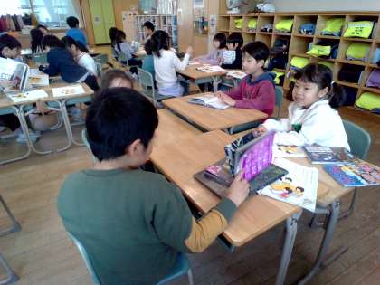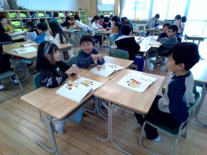 自分の好きな本を友達に紹介しました。友達の話を聞いて、質問をし合ったりおすすめの場面を紹介し合ったりしていました。どのグループも笑顔で話をしている姿が見られました。