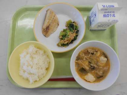 ごはん、ぎゅうにゅう、さばのしおやき、ねばーるなっとうあえ、ぜんしゅうちゅうごまキムチなべ