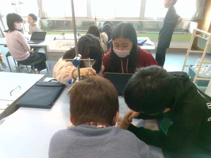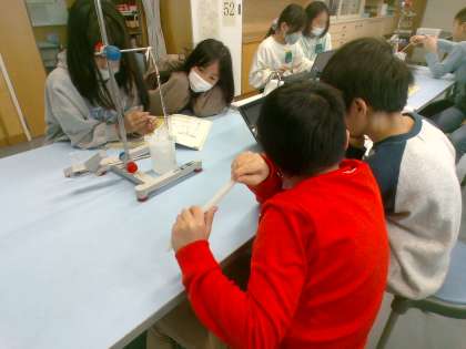 水を冷やしたときの実験を行っています。冷やすと試験管の中が凍る様子を見て驚いています。