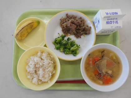 むぎごはん、ぎゅうにゅう、パワーぎゅうぎゅうどん、ゆでブロッコリー、ぐだくさんじる、バナナ
