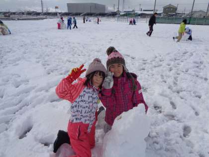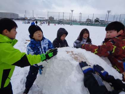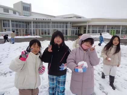 3年生で、雪遊びをしました。広いグラウンドで思いっきり雪に寝そべったり、雪だるまを作ったりして楽しみました。