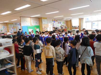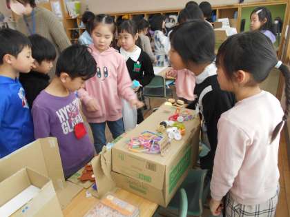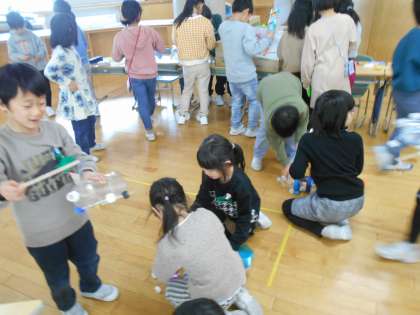 今日は、生活科「うごくおもちゃ」で1年生さんを招待しました。2年生がお兄さんお姉さんとして、おもちゃ遊びのルールを説明したり、手を取ってやり方を教えてあげたりしました。