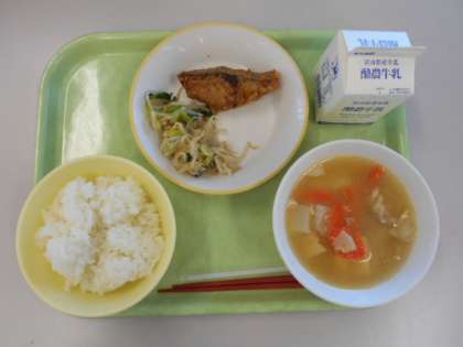 ごはん、ぎゅうにゅう、さかなのりきゅうあげ、もやしのおひたし、ぶたじる