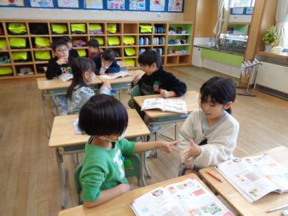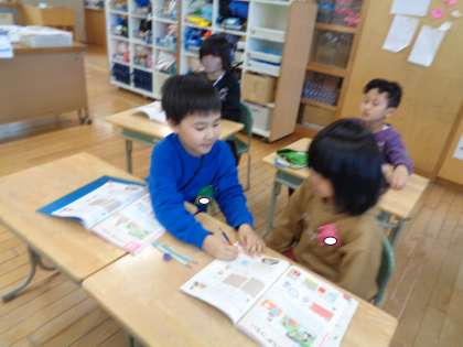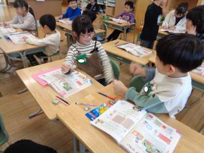 算数では、「どちらが ひろい」の学習をしています。今日は友達とじんとりゲームをして、どちらが広く陣取りできたかを比べました。