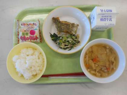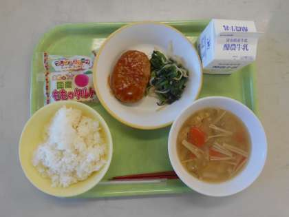 ごはん、ぎゅうにゅう、◆さかなのいそべあげ◆ハンバーグのケチャップに、はりはりあえ、ぐだくさんじる、○もものタルト○みかんババロア