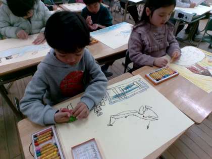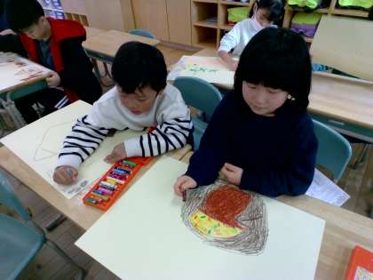 図画工作科では、物語を読んで想像したことを絵に表す学習を行っています。クレヨンで思い思いの絵を描きました。