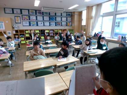 ペアの友達と相談して考えたクイズをみんなに出題して楽しみました。