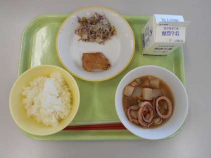ごはん、ぎゅうにゅう、てりやきチキン、ゆかりあえ、さといもといかのにもの