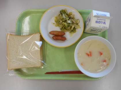 食パン、ぎゅうにゅう、あらびきウインナー、こめこシチュー、ブロッコリーときのこのアヒージョ