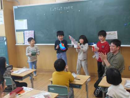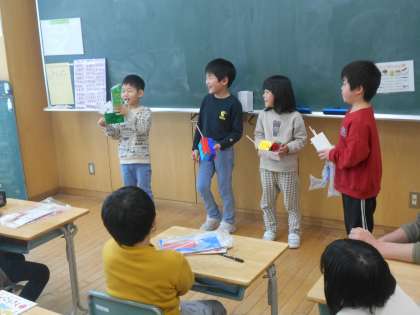 それぞれイメージを膨らませて、にょきにょき飛び出す仕組みを考えてつくりました。交流級の友達より早めにつくったので、今日は見本として見せに行きました。みんなから「すごいね」と言われて、うれしそうな1年生たちでした。