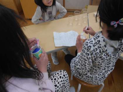 わかば級では、今お店屋さんごっこが盛り上がっています。わかば1組では「ジュース屋さん」と「お寿司屋さん」、わかば4組では「パフェ屋さん」が開店しています。今日はわかば級の4年生のお姉さんたちが遊びに来てくれていました。みんなで仲良く楽しむことができました。