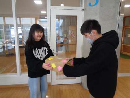 わかば級では卒業を祝うために、縦割り班での活動をしています。今日は、自分たちで作った卒業を祝う集会で6年生に着てきてほしい変身グッズを渡しました。6年生も照れながら、「ありがとう」と受け取ってくれて、「中を見てもいい?」と優しく聞いてくれました。
