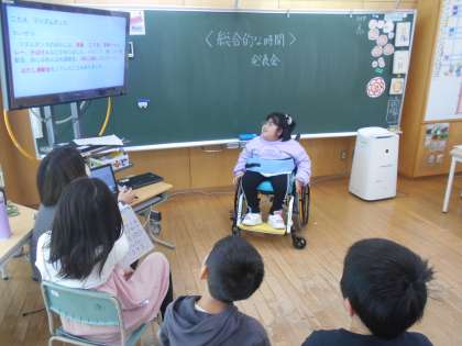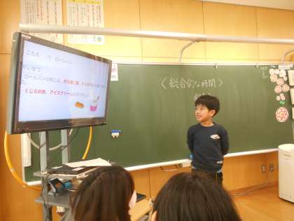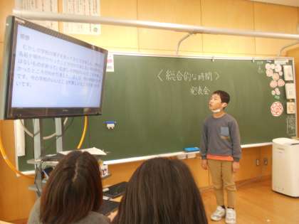 豊田小学校の今と昔について調べてきたことを、クイズ形式にして発表しました。クイズの答えを伝えるたびに、「へぇ−、そうなんだ!」という反応が返ってきて、うれしそうな3年生でした。
