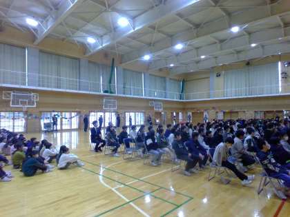 最初のプログラムは、5年生からの劇発表です。1年生から6年生までの思い出について6年生にとったアンケートをもとに、発表内容を考えました。当時の様子を再現したり、人気のあった給食についてのアンケート結果発表をしたりするなど、6年生が思い出を振り返ることができるように工夫をしました。