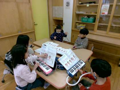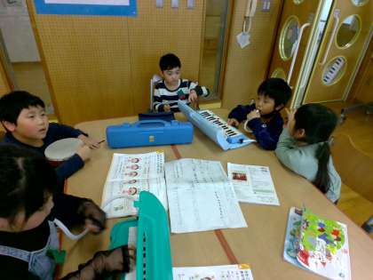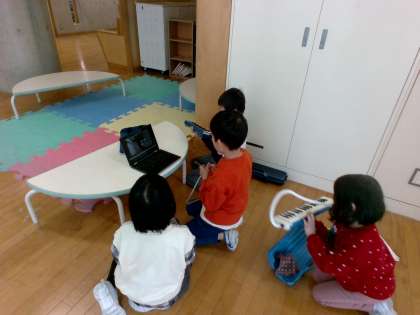グループに分かれて合奏の練習をしています。自分の担当する楽器の練習をしたり、グループの合奏の様子を動画で撮影したりして、自分たちの合奏がよりよいものになるように練習しています。