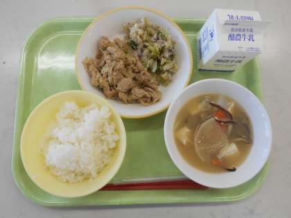 ごはん、ぎゅうにゅう、ぶたにくのしょうがやき、ゆかりあえ、けんちんじる