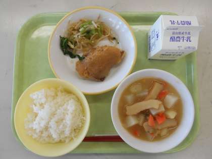 ごはん、ぎゅうにゅう、さかなのあまみそかけ、おひたし、かんとうだき