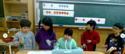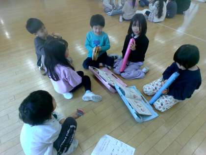 音楽科「みんなであわせてたのしもう」の学習では、リズムを合わせて「とんくるりん ぱんくるりん」を演奏しました。