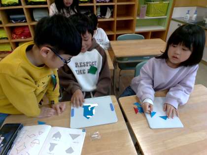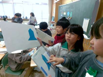 算数科「かたちあそび」の学習では、三角形の色板を使ってロケットや船等のいろいろな形をつくりました。よく見ると、大きな三角形があったり、四角形が隠れていることに気付きました。