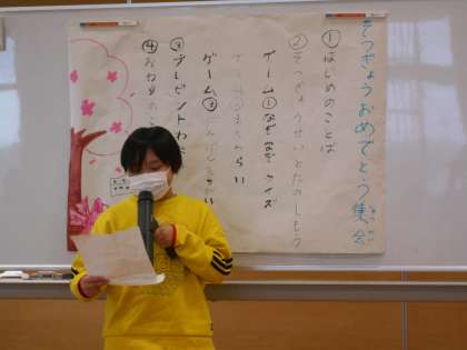 お祝いの準備をしてきたわかば級の在校生から、卒業生へ向けての集会を行いました。