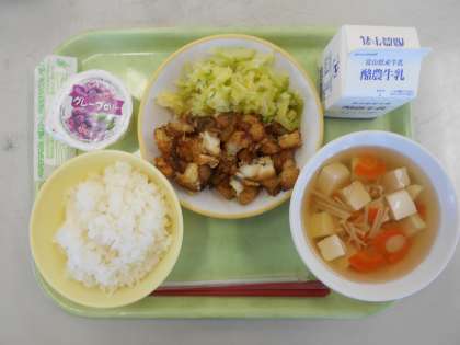 ごはん、ぎゅうにゅう、さかなとじゃがいものえごまみそからめ、ゆでキャベツ、すましじる、ぶどうゼリー