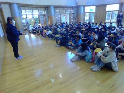 今年度、ALTとして外国語の学習を支援していただいたレイチェル先生の授業最終日となった15日、5年生で感謝の集いを行いました。英語で書いたお手紙を5年生からプレゼントすると、レイチェル先生は、英語でお礼のスピーチをしてくださいました。この1年間で、おおよその内容が分かるようになった5年生は、しきりにうなずきながら聴いていました。