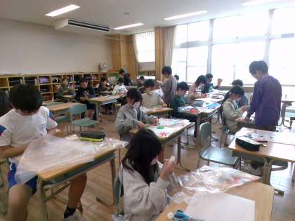 光がはいるとどのような作品になるか確かめながら、作品づくりに取り組んでいます。