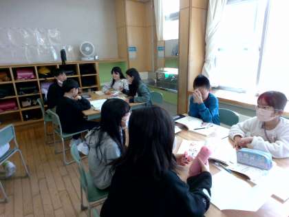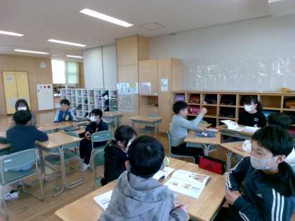 会話から気持ちや様子を表すひみつの言葉を引き出す、言葉の準備運動を行いました。「迫力のある」を引き出すために、映画館や遊園地の遊具の例を出して、会話を楽しんでいました。