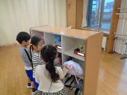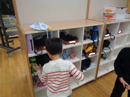 学校へ持ってきた荷物をロッカーに自分で片付けました。上手に片付けることができました。